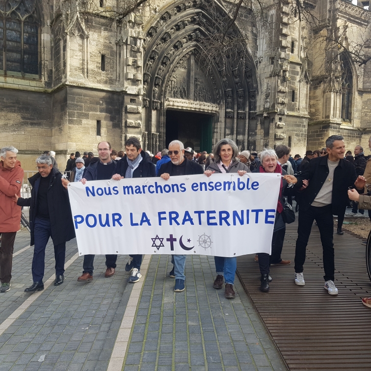 A l’occasion de la Journée internationale de la Fraternité humaine, dimanche 8 février, de la mosquée du quartier des Capucins à la synagogue proche de la Place de la Victoire en passant par la basilique Saint Michel et le temple protestant de la rue du Hâ, plusieurs centaines de personnes, parmi lesquelles des agnostiques, ont marché pour la paix la fraternité et la solidarité, principalement donc dans ce quartier emblématique de Saint-Michel où se côtoient traditionnellement de nombreuses origines. « Les religions portent dans leur ADN la fraternité et le vivre-ensemble, a contrario de ce que certains peuvent dire ou écrire (1) », selon Daniel Ambry, de la Fédération des Protestants de France, l’un des animateurs de cette manifestation interreligieuse pour la fraternité. La fraternité mais aussi la paix et le solidarité entre musulmans, juifs et chrétiens que ces derniers soient catholiques, orthodoxes ou protestants. Chaque représentant de la religion du Livre a rappelé l’urgence de se serrer les coudes dans ces temps de montée irrépressible de la violence et des insultes de l’extrême droite avant de se retrouver dans les jardins de la mairie accueillis par Pierre Hurmic.